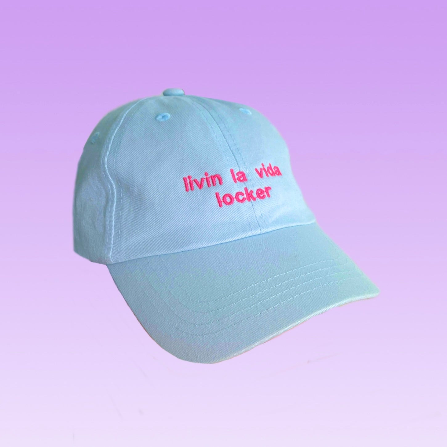 Dein mausiges Essential für sonnige Tage 🐭 ☀️ ONE SIZE & UNISEX, Pastell blaue Cap mit pinkem Stick "Livin la vida locker", anpassbare Größe, Low Profile Dad Cap Modell